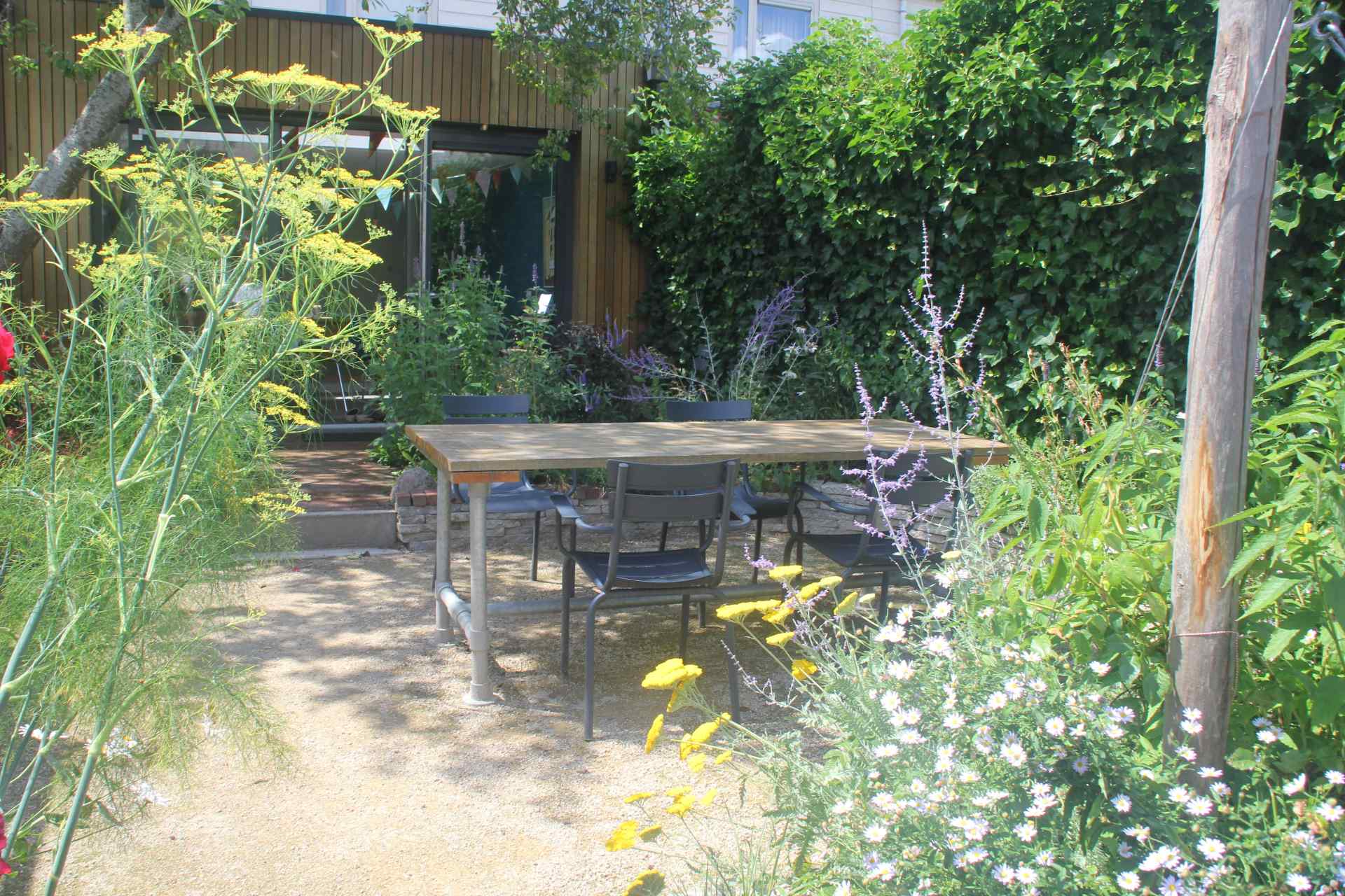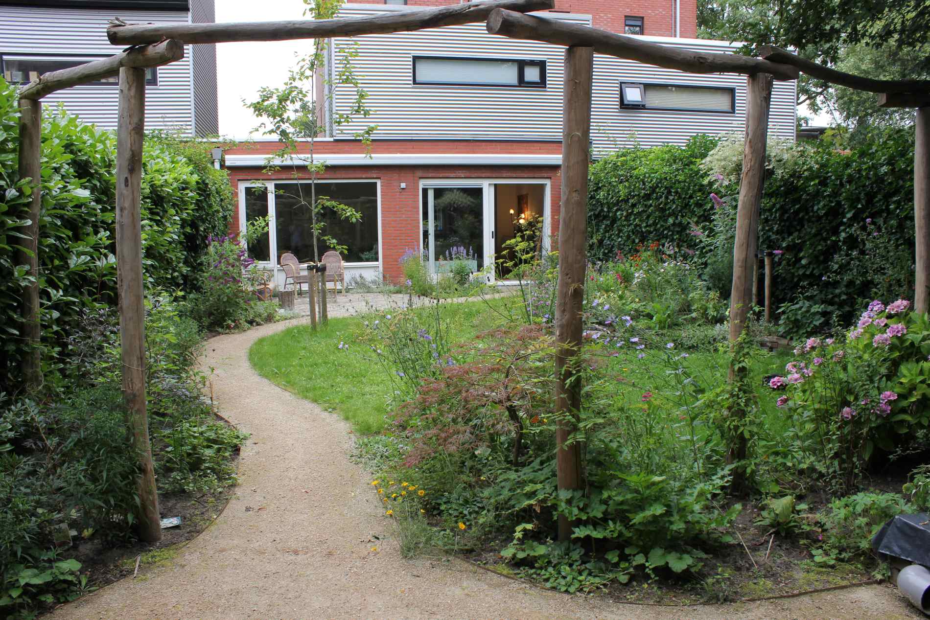 Voortuin met verhoogd vlonderterras en splitoprit in bloemenweide