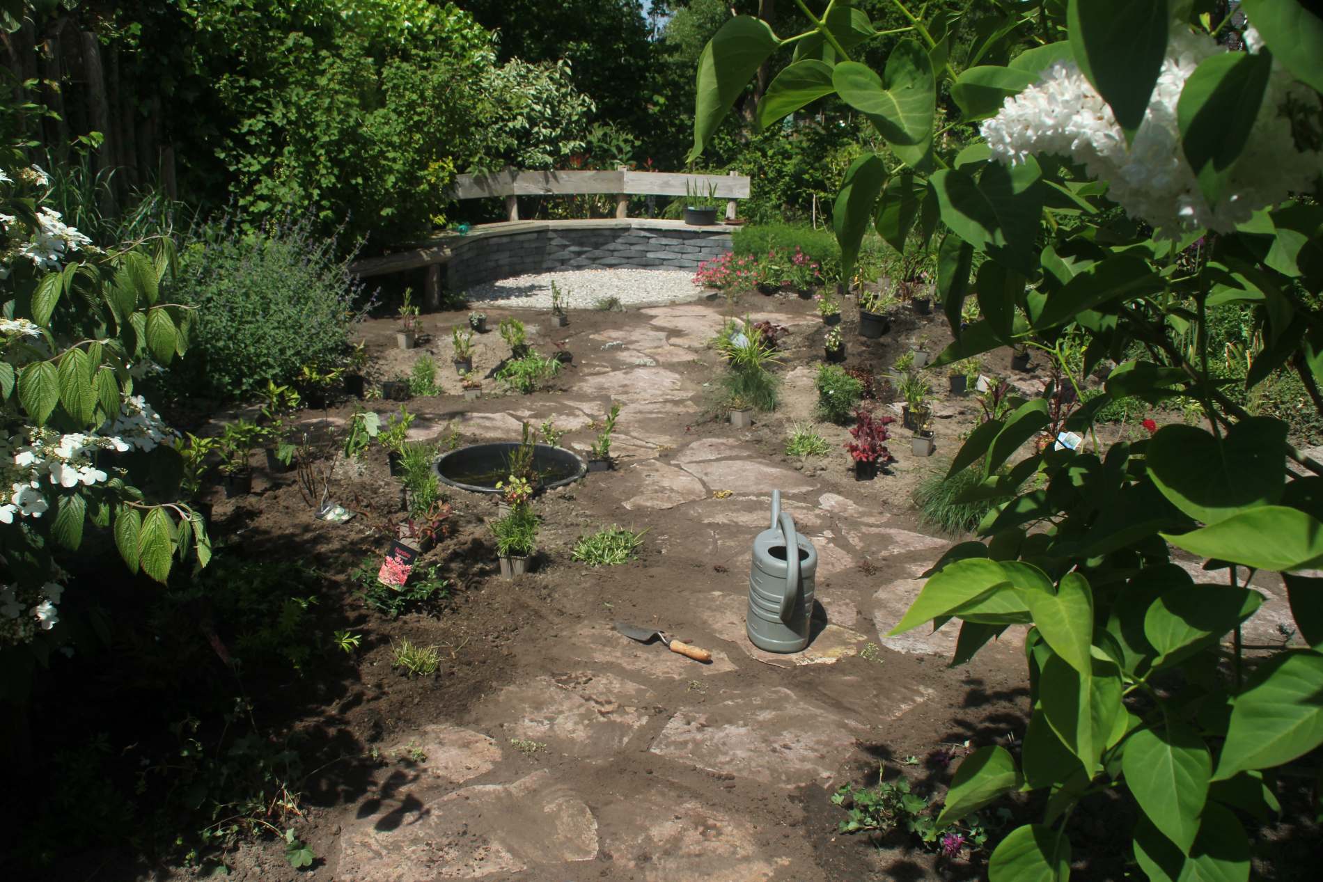 Stapelmuur, stapelbank, plantenbak en vijver.