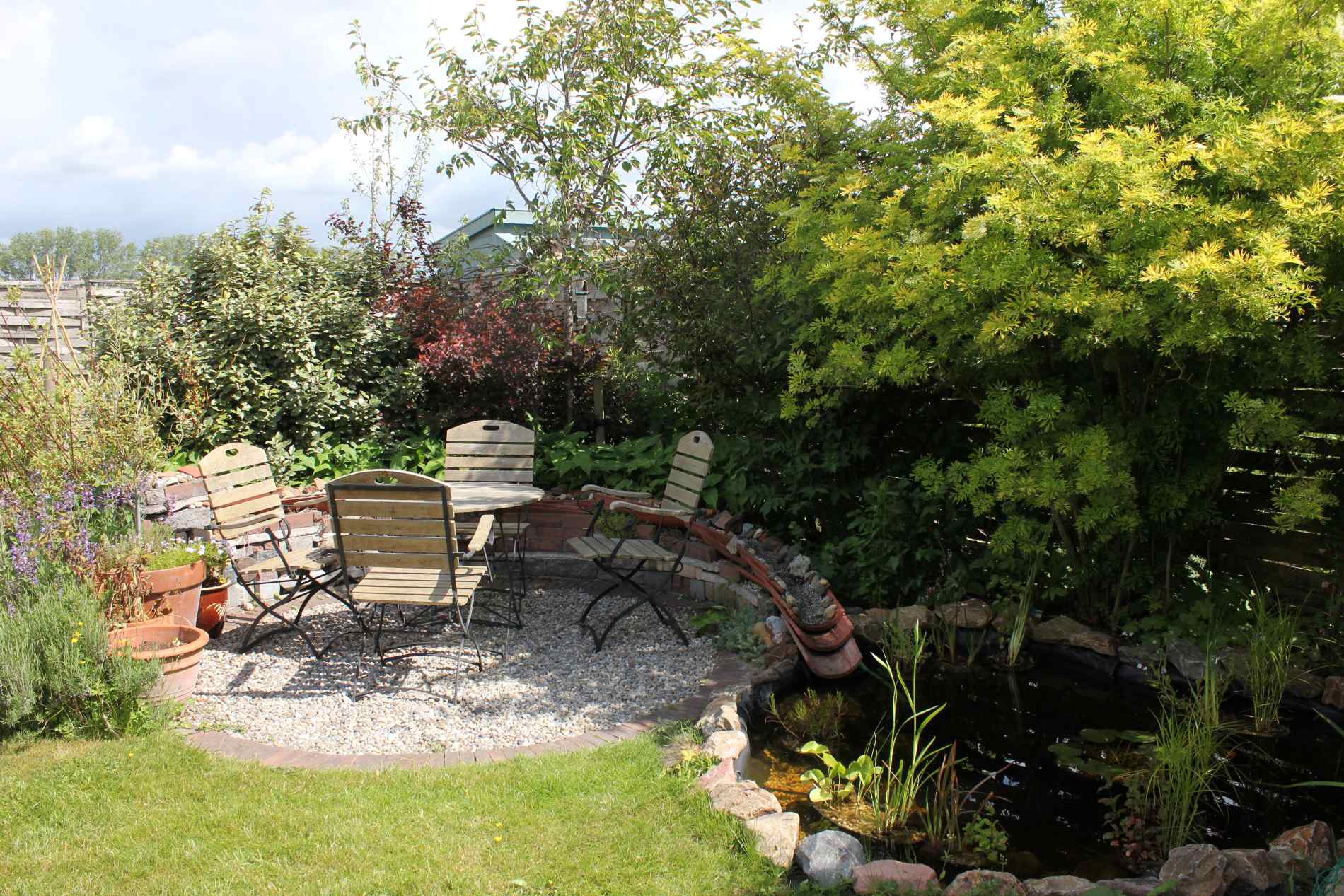 Speelse achtertuin in dorp met vijver en veranda