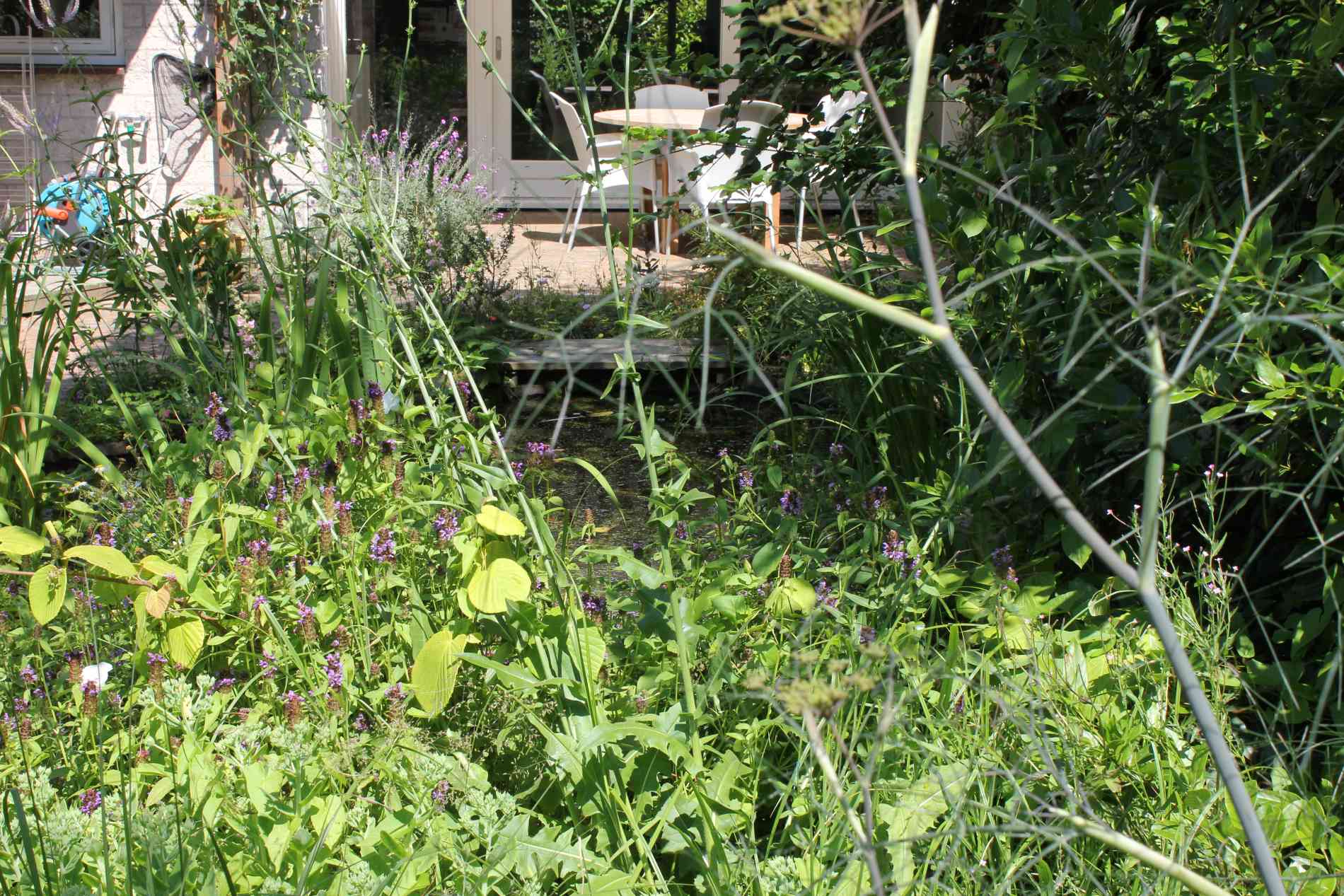 Speelse achtertuin in dorp met vijver en veranda