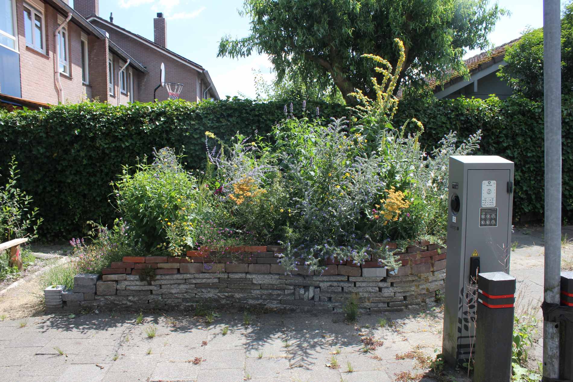 Bloem en moestuinbak, compostbak en takkenril, containeropslagplaatsen.