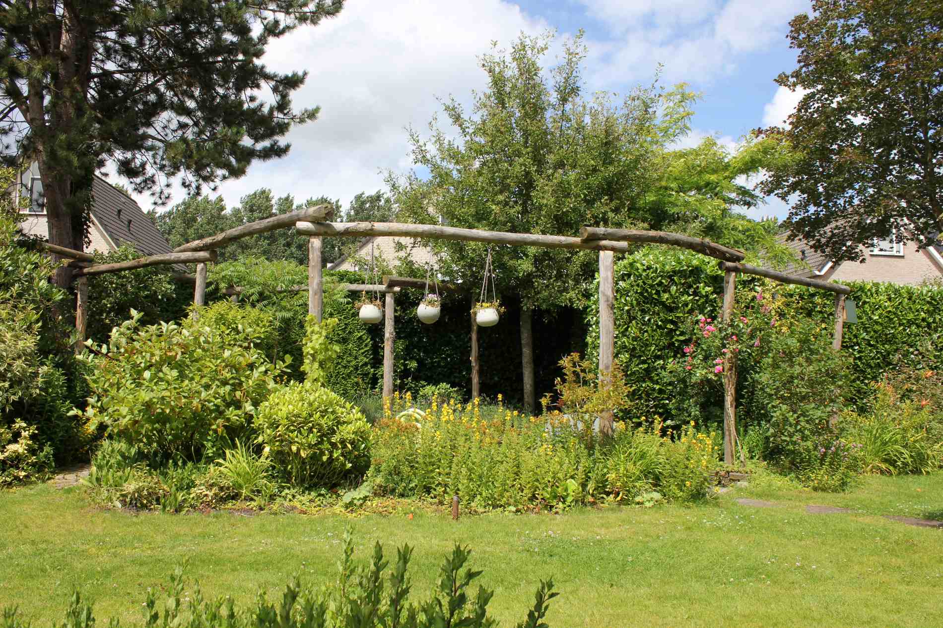 Achtertuin met heuvels, gras en bloemen